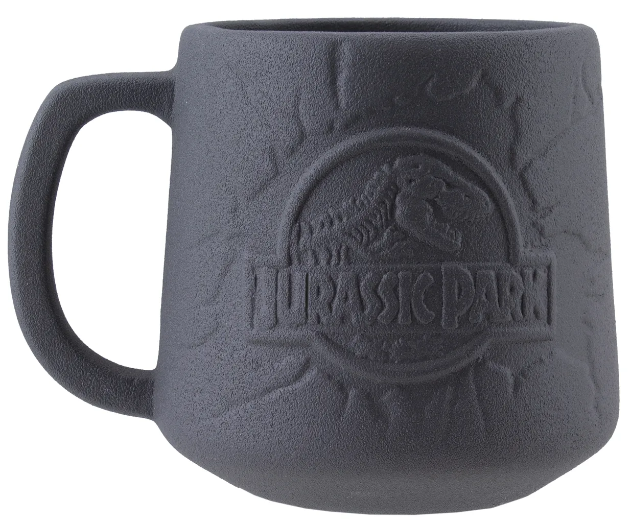 3D keramička šalica sive boje s motivom logotipa Jurskog parka.