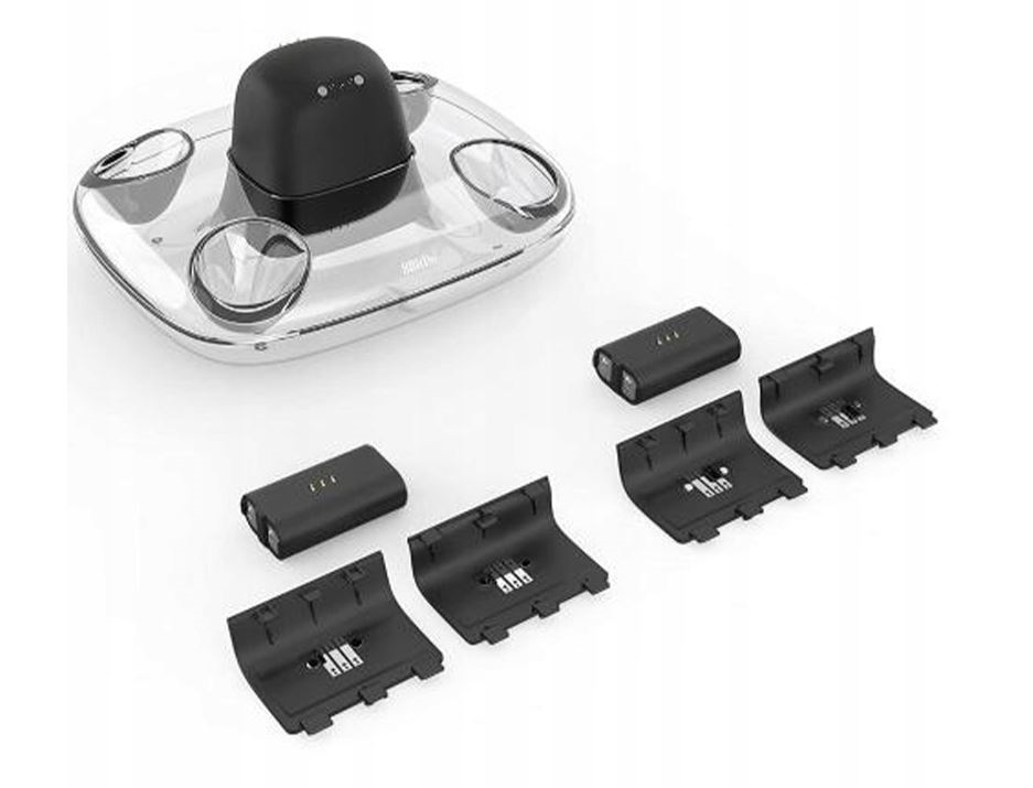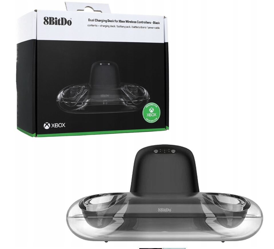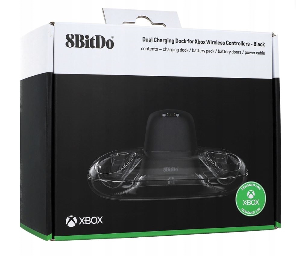 U paketu se nalazi stanica za punjenje 8BitDo, dvije baterije za kontrolere kapaciteta 1100 mAh, četiri poklopca za zatvaranje baterija (2 za Xbox Series X/S i 2 za Xbox One) i napajajući adapter. Kontroleri nisu uključeni u ovaj set.