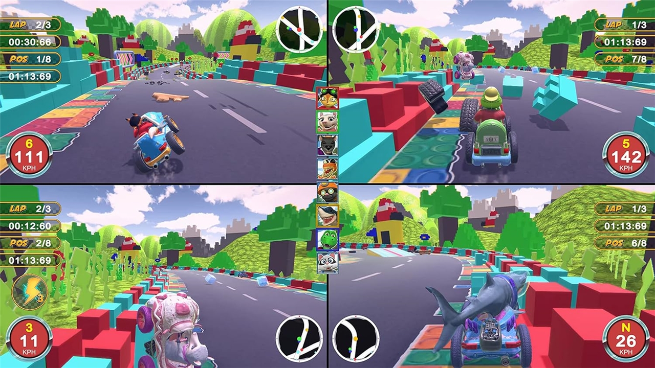 Odaberite svog vozača iz jedne od 16 komičnih likova – uključujući rakuna, dabra, vuka, morskog psa ili krokodila! Natječite se na 20 uzbudljivih staza punih oštrih zavoja, opasnih prepreka i nečekanih iznenađenja. Probijajte predmete koje možete uništiti, skačite s rampi i pokušajte izbjeći oborena stabla, kamenje, led i naftne mrlje. Krenite na put, pritisnite papučicu gasa i uživajte u intenzivnim utrkama kartinga u različitim režimima.