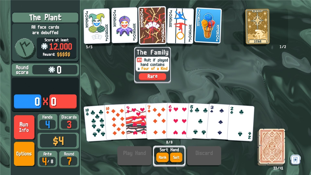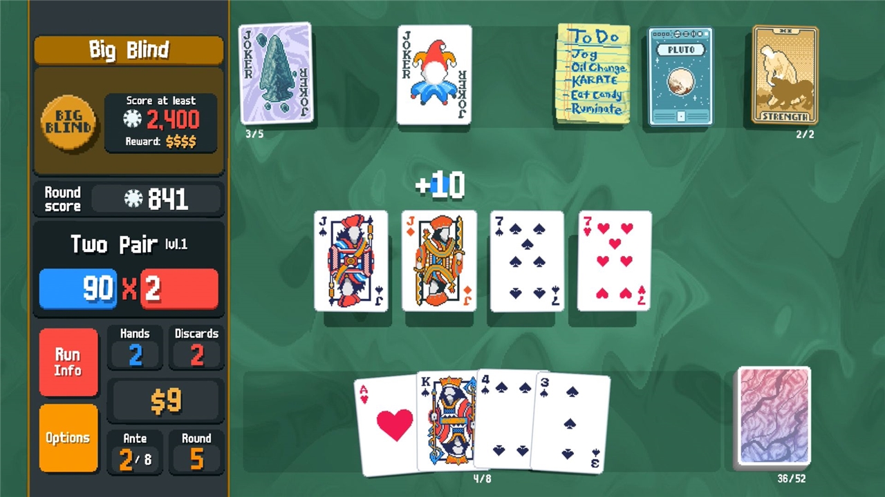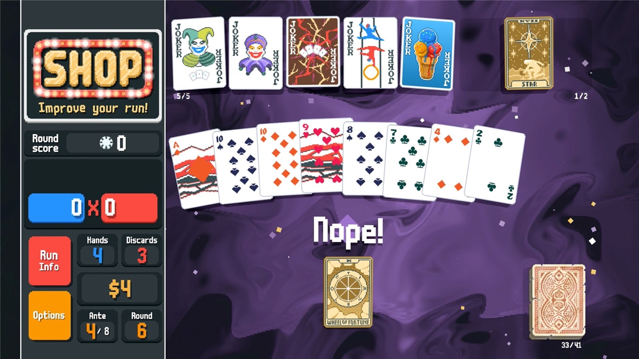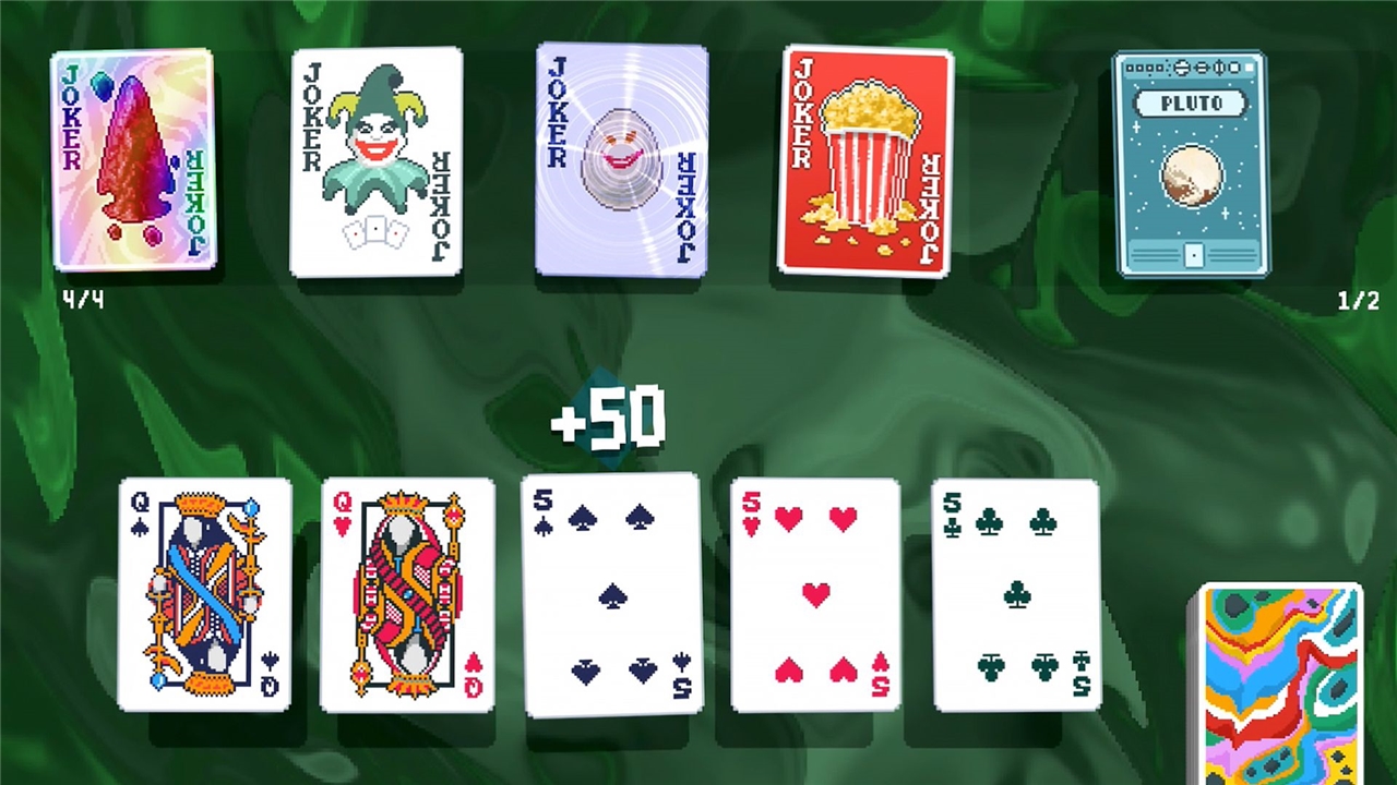 Stvarajte poker kombinacije, spajajte ih s jedinstvenim džoker kartama i zarađujte na njihovim raznolikim sinergijskim učincima. Prikupljajte potrebni broj žetona, pobjeđujte u okršajima protiv podmuklih blindova i postupno otkrivajte skrivene poker kombinacije i dodatne špilove. Da biste stigli do posljednjeg boss blindu, uspješno završili završnu ante i ostvarili pobjedu, trebat će vam svaka zamisliva prednost!