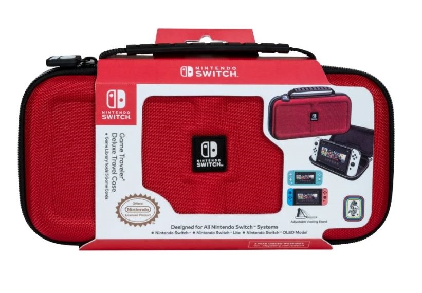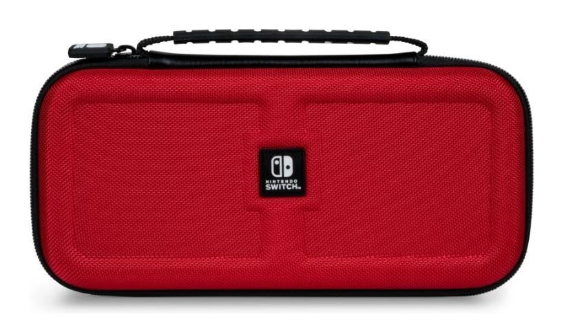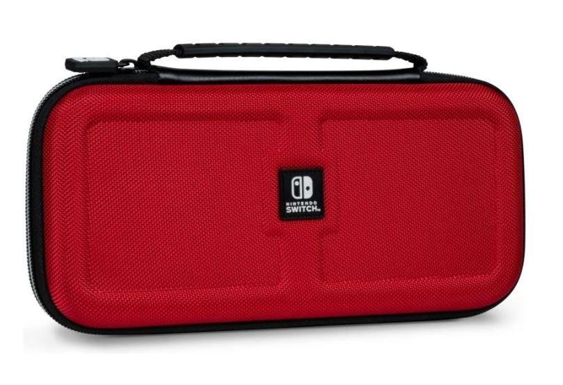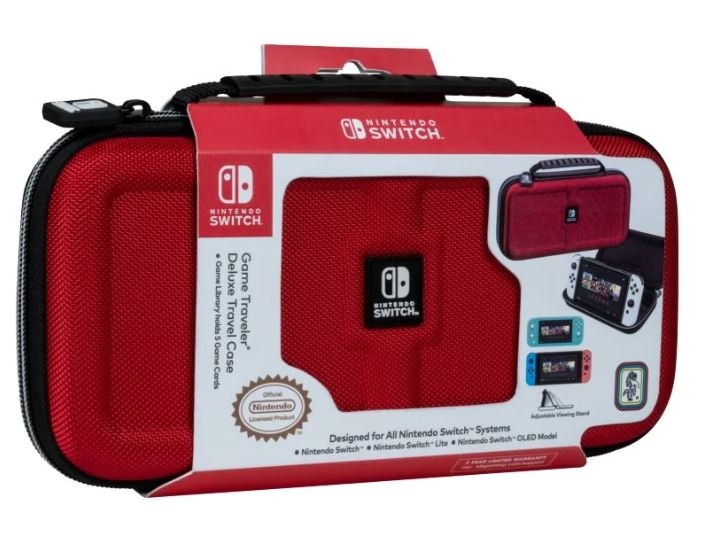 Putno kućište u luksuznoj crvenoj boji održat će vašu igraću konzolu Nintendo Switch sigurnom bez obzira kamo krenete. Kućište ima podesivi stalak i kvalitetan zatvarač. U kućište, osim igraće konzole, također možete spremiti zaštitne nastavke Action Grip za Joy-Con kontrolere i zaštitne čepiće Thumb Grip za analogne palice. Pakiranje sadrži dvije plastične kutijice za igraće kartice i pretinac za microSD kartice.