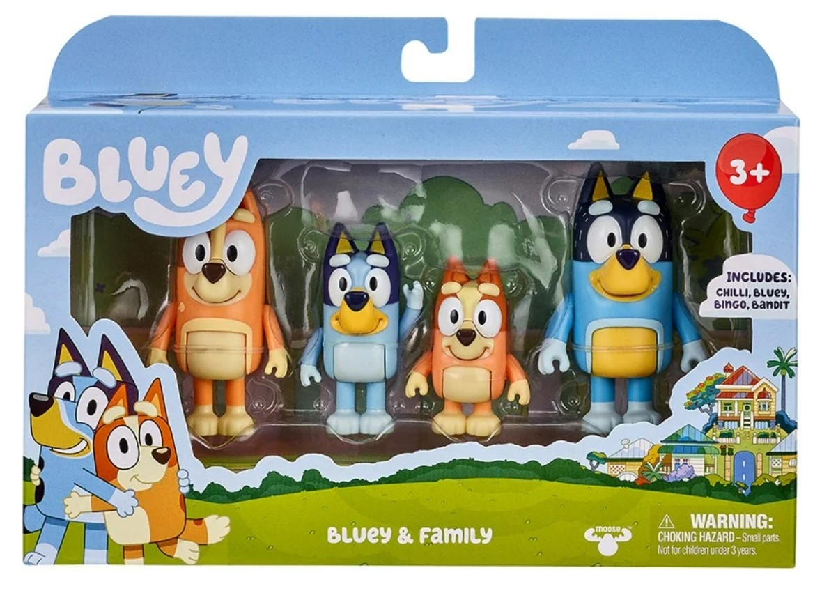 Skupi cijelu pseću obitelj iz dječje serije s ovim pakiranjem, koje sadrži figurice Bluey, njezinu sestru Bingo, mamu i tatu. Figurice imaju pokretne zglobove za više zabave tijekom igranja.