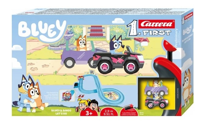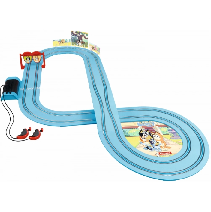 Uđite u svijet zabavnih utrka s autićnom stazom Carrera FIRST Bluey & Bingo, koja je idealna kao prva utrkivačka staza za djecu od 3 godine. Staza dužine 2,9 metra donosi mnogo akcije, smijeha i napetosti – djeca mogu uživati u utrkama omiljenih likova Bluey i Bingo te istovremeno razvijati motoričke vještine i koncentraciju.