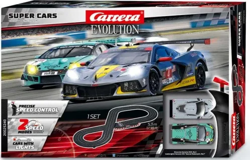 Staza Carrera EVOLUTION duga 5,3 m s automobilima Lamborghini Huracán i Chevrolet Corvette sadrži ravne dionice, zavoje, mostove, ručke za kontrolu brzine i ostale dijelove.