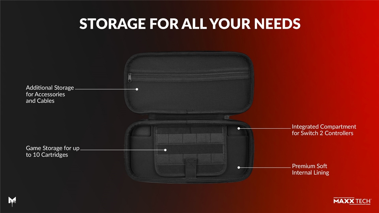 Čuvajte svoj Nintendo Switch™ 2&1 i dodatke sigurnima tijekom putovanja zahvaljujući ovoj elegantnoj i izdržljivoj torbici za nošenje. Ova kompaktna torbica za nošenje dizajnirana je za ultimativnu zaštitu i udobnost te osigurava sigurnost vaše konzole tijekom putovanja. Po mjeri izrađena unutrašnjost uključuje posebno odvojene dijelove za vaš Switch, Joy-Con kontrolere i igraće karte kako biste sve imali organizirano i lako dostupno.