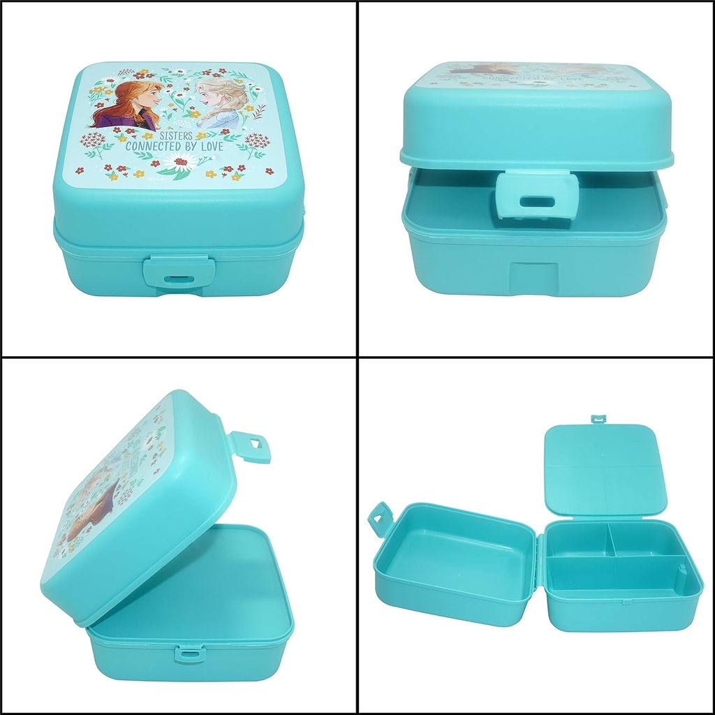 Praktična plastična kutija za užinu s motivom Snježnog kraljevstva. Kutija je izrađena od kvalitetnog zdravstveno neškodljivog materijala i dovoljno je prostrana, s tri odvojena pretinca i unutarnjim poklopcem. Zahvaljujući praktičnom zatvaraču sadržaj se neće prosuti. Kutija nije pogodna za mikrovalnu pećnicu niti za perilicu posuđa.