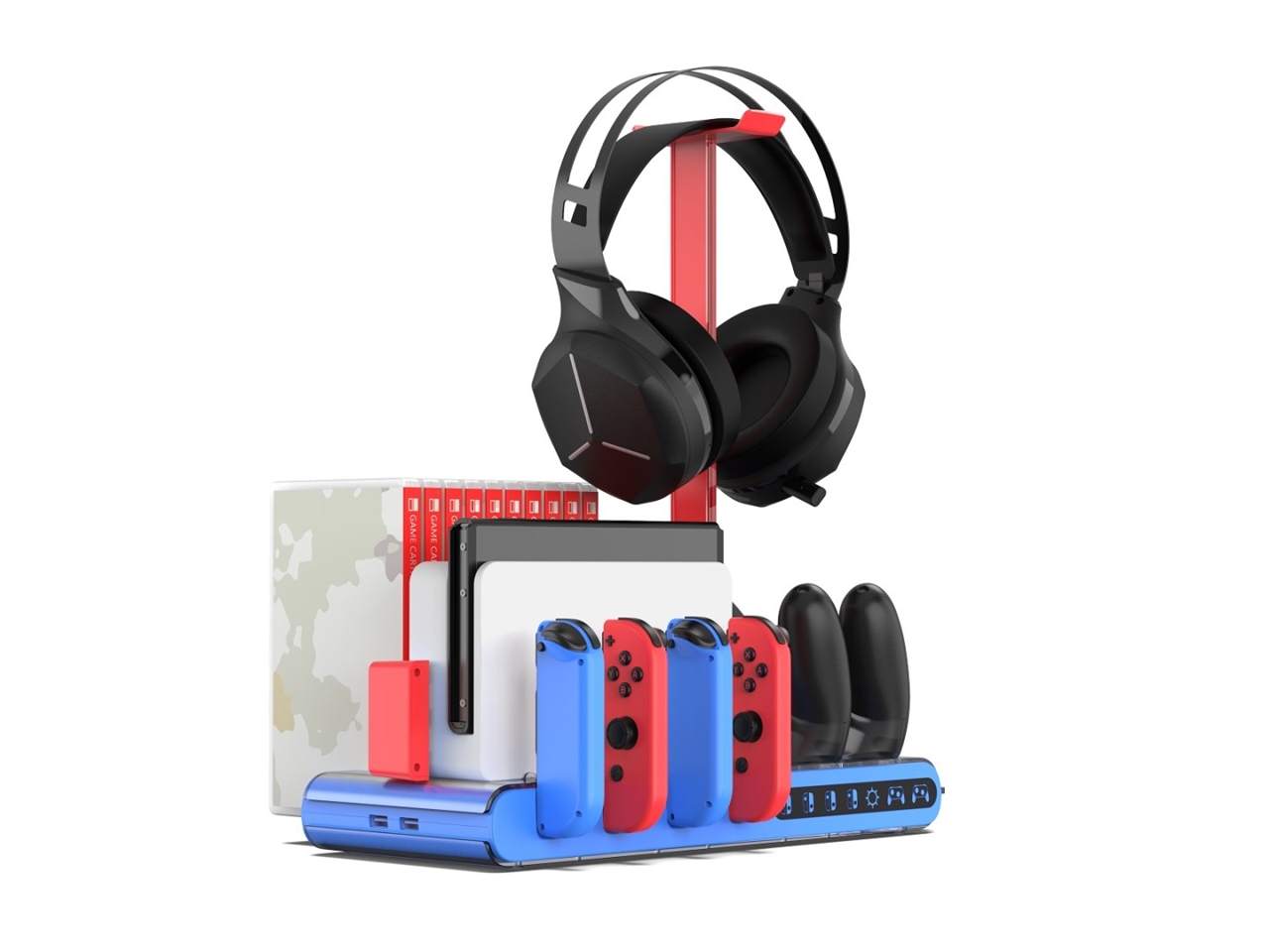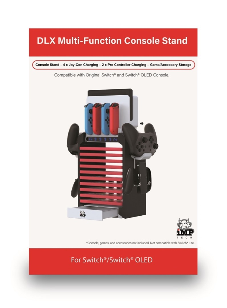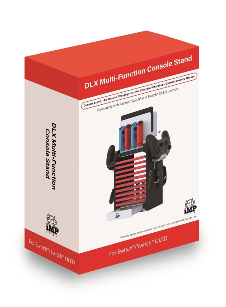Ovaj višenamjenski stalak, koji štedi prostor i je napajan vašim Switch adapterom naizmjenične struje (nije uključen u paket), omogućuje punjenje vaših igraćih kontrolera i pohranjivanje konzole, igara, kontrolera i dodataka.