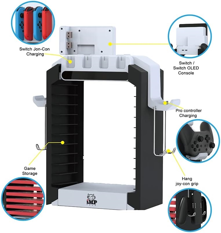 Višenamjenski stalak za konzolu Nintendo Switch s integriranim priključcima za punjenje za do 4 Joy-Con kontrolera i 2 Pro kontrolera istovremeno. Pogodno za standardnu Switch konzolu i OLED Switch verziju, jednostavno priključite dock stanicu na stalak zajedno s originalnim napajanjem (kabelom), kako biste sve stavili u pogon. Također sadrži prostor za pohranu za do 10 spremnika za igre i izvlačivu ladicu za pohranu kartica za igre i manjeg pribora, poput navlaka za palčeve i kabela. Dodatne kukice za pohranu nude praktično mjesto za vješanje bilo kojih dodatnih kontrolera ili slušalica. LED indikatori punjenja informiraju vas o razinama napunjenosti kontrolera i osiguravaju da ne propustite ni sekundu vaše gejmerske sesije.
