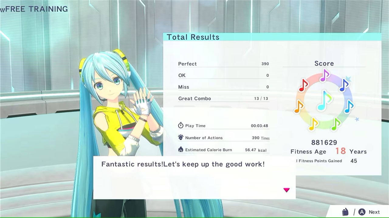 Fitness Boxing podržava igrače u njihovom svakodnevnom vježbanju nudeći širok raspon mogućnosti zagrijavanja, podešavanja težine i mogućnost vježbanja pojedinačnih pokreta. Redoviti instruktori Lin i Evan iz serije također će se pridružiti zabavi. Sve značajke za podršku vježbanju u igri Fitness Boxing, kao što su dnevni pečati koji bilježe povijest vježbanja i sustav upravljanja ciljevima, ostaju iste, sada s Hatsune Miku koja će vas voditi na vašem fitness putovanju!