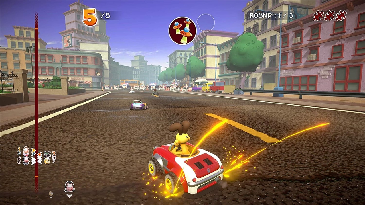 Odaberi svog omiljenog lika i izaberi kart prema njegovim svojstvima i tvom stilu vožnje, tempiraj start što preciznije i pomoću kontroliranih driftova pretekni protivnike u zavoju. Zahvaljujući ludim bonus predmetima, poput jastuka ili čarobnog štapića, stekni prednost nad ostalima i prijeđi ciljnu crtu kao prvi. A ako si jednako lijen kao Garfield, iskoristi oprugu, prođi prečacem i pokaži protivnicima leđa! Na ukupno šesnaest staza iz Garfieldova svijeta možeš dodatno voziti s prijateljima, i to u lokalnoj ili online igri.