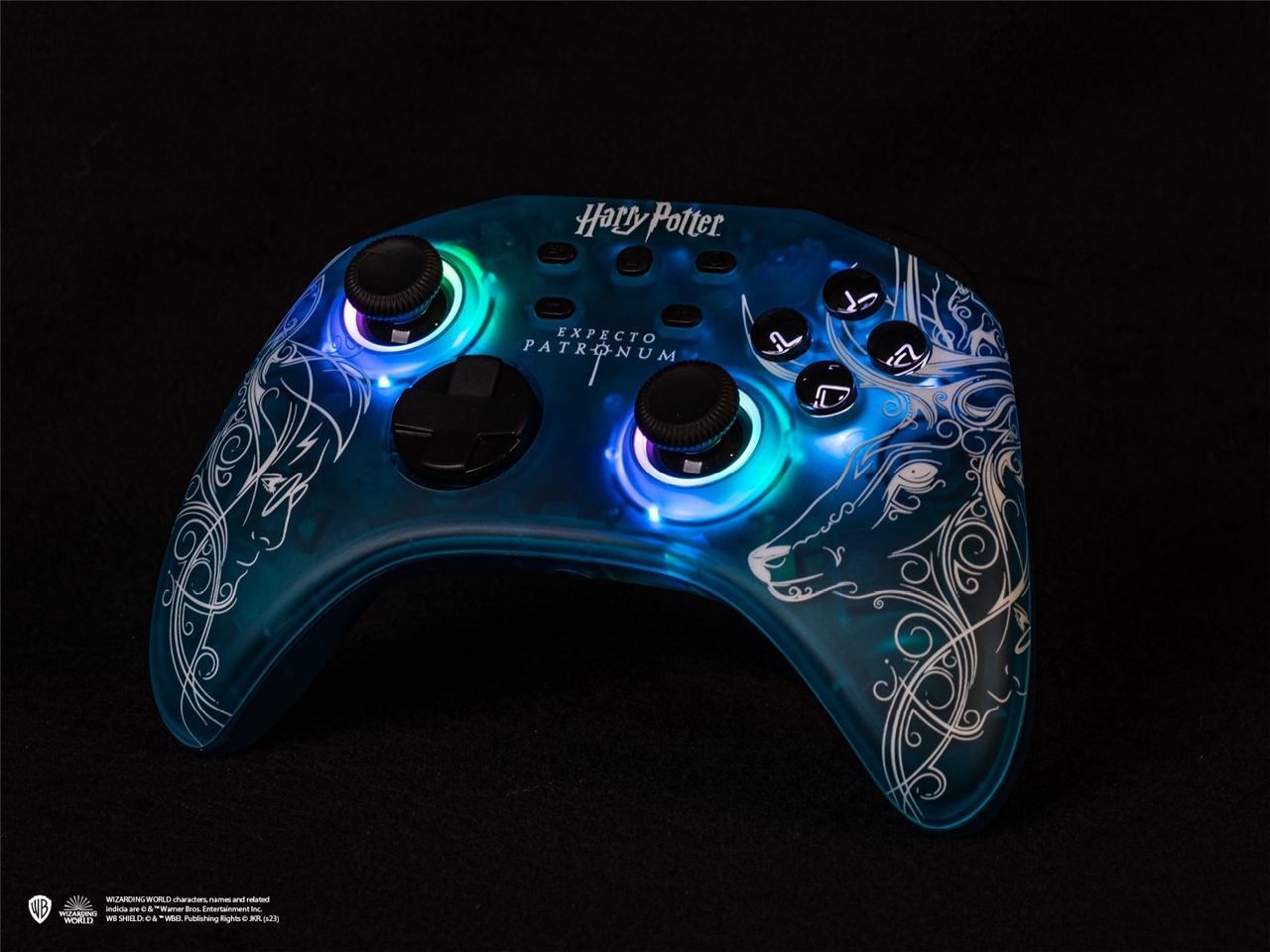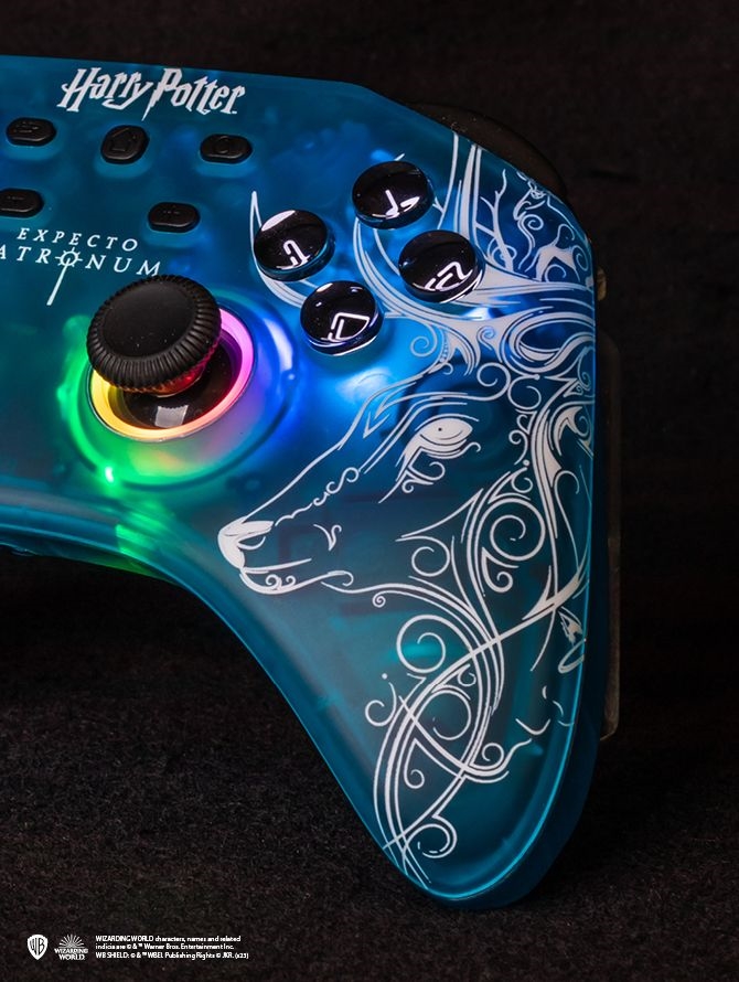 Ovaj službeno licencirani bežični igraći kontroler s motivom Patronusove čarolije iz popularnog čarobnjačkog svijeta Harryja Pottera namijenjen je svim vlasnicima igraćih konzola Nintendo Switch i Nintendo Switch – OLED Model. Kontroler na prvi pogled privlači ne samo prekrasno prikazanim motivom koji prikazuje Harryja sa svojim životinjskim patronom, nego i šarenim osvjetljenjem oko analognih štapića i akcijskih tipki. Osim standardnih elemenata, kao što su dvije gornje tipke, dva okidača, par vibracijskih motora ili podrška za funkciju upravljanja pokretom, kontroler također nudi dvije programabilne tipke, četiri LED indikatora koji služe za praćenje stanja napunjenosti i tijeka punjenja ugrađene punjive baterije te tipku Turbo, koja će vam olakšati ponovljeno pritiskanje tipki i okidača.