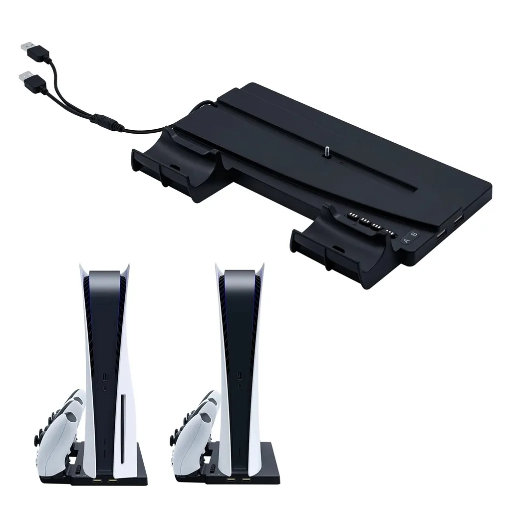Stalak za konzole PS5, PS5 Digital. Sadrži također 2 priključka za punjenje Dualsense kontrolera.