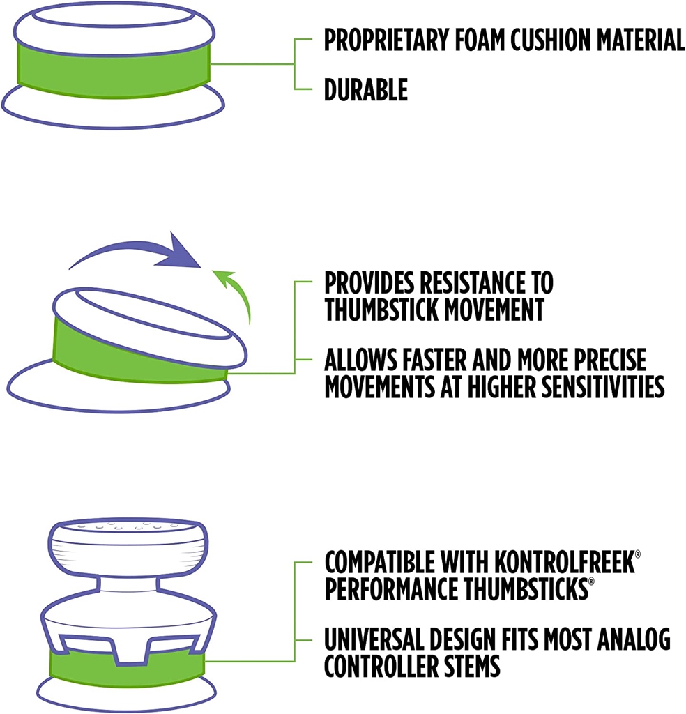 Idealno za igranje pucačina; ti prstenovi stvaraju otpor pri pokretu analognih palica i tako poboljšavaju ciljanje protivnika. Fleksibilni materijal koji odvodi vlagu otporan je na masnoću ruku i prstiju, prigušuje zvuk i brzo se vraća u prvobitni oblik, pa prstenove možete koristiti iznova i iznova.