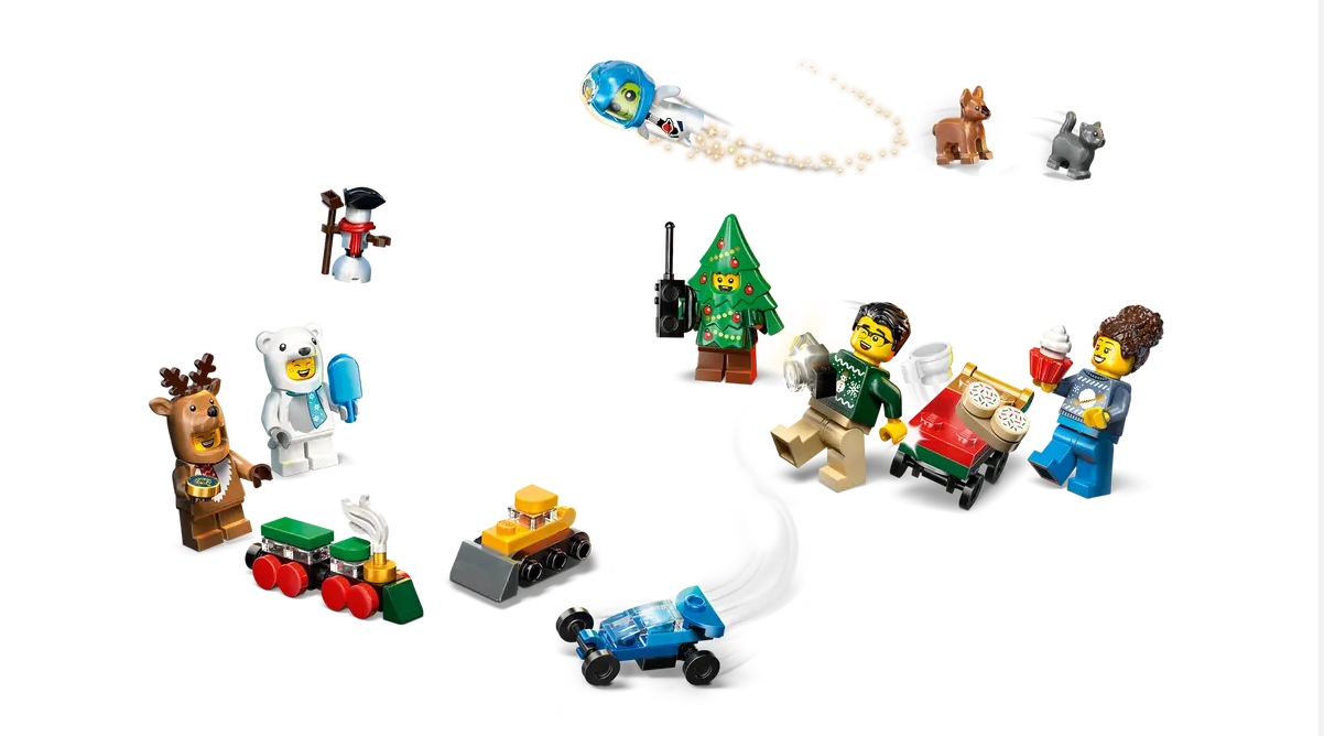 Kalendar je pun blagdanskih minifigura i mini modela – pronaći ćete figure odjevene kao polarni medvjed, sob i božićno drvce, ali i Djeda Božićnjaka s gospođom Claus i mnogo drugih dodataka koji proširuju mogućnosti igre. Nakon rasklapanja pakiranja pojavljuje se podloga za igru s motivom božićne zabave, gdje djeca mogu izvoditi vlastite zimske priče.