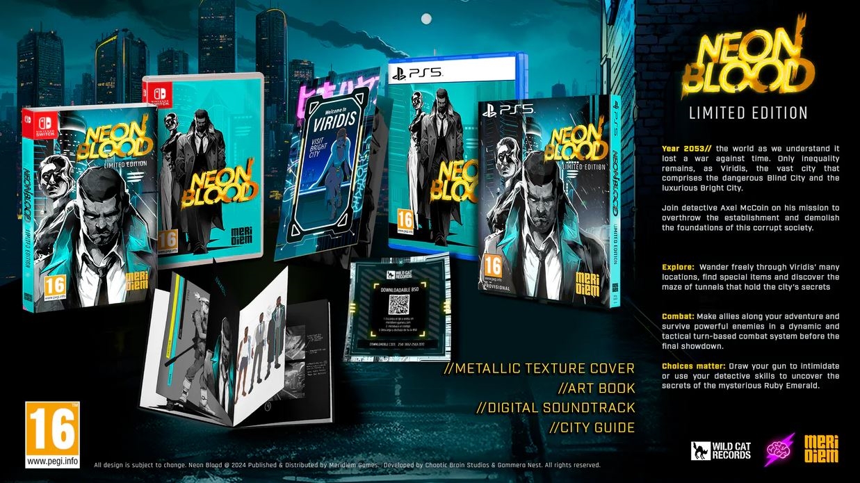 Fizičko limitirano izdanje igre Neon Blood za PlayStation 5 i Nintendo Switch sadrži metalnu teksturiranu kutiju, art book, vodič kroz grad i preuzimljivi soundtrack.