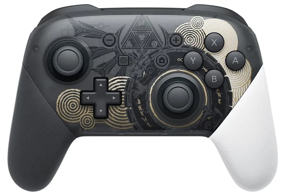Gamepad za Nintendo Switch. Crno-bijeli dizajn sa zlatnim detaljima daje kontroleru na ljepoti i naglašava da potječe iz posebnog izdanja dizajniranog za igru The Legend of Zelda: Tears of the Kingdom. Uputite se na epsku avanturu po zemlji i nebu Hyrule s kontrolerom Nintendo Switch™ Pro Controller - The Legend of Zelda: Tears of the Kingdom Edition!