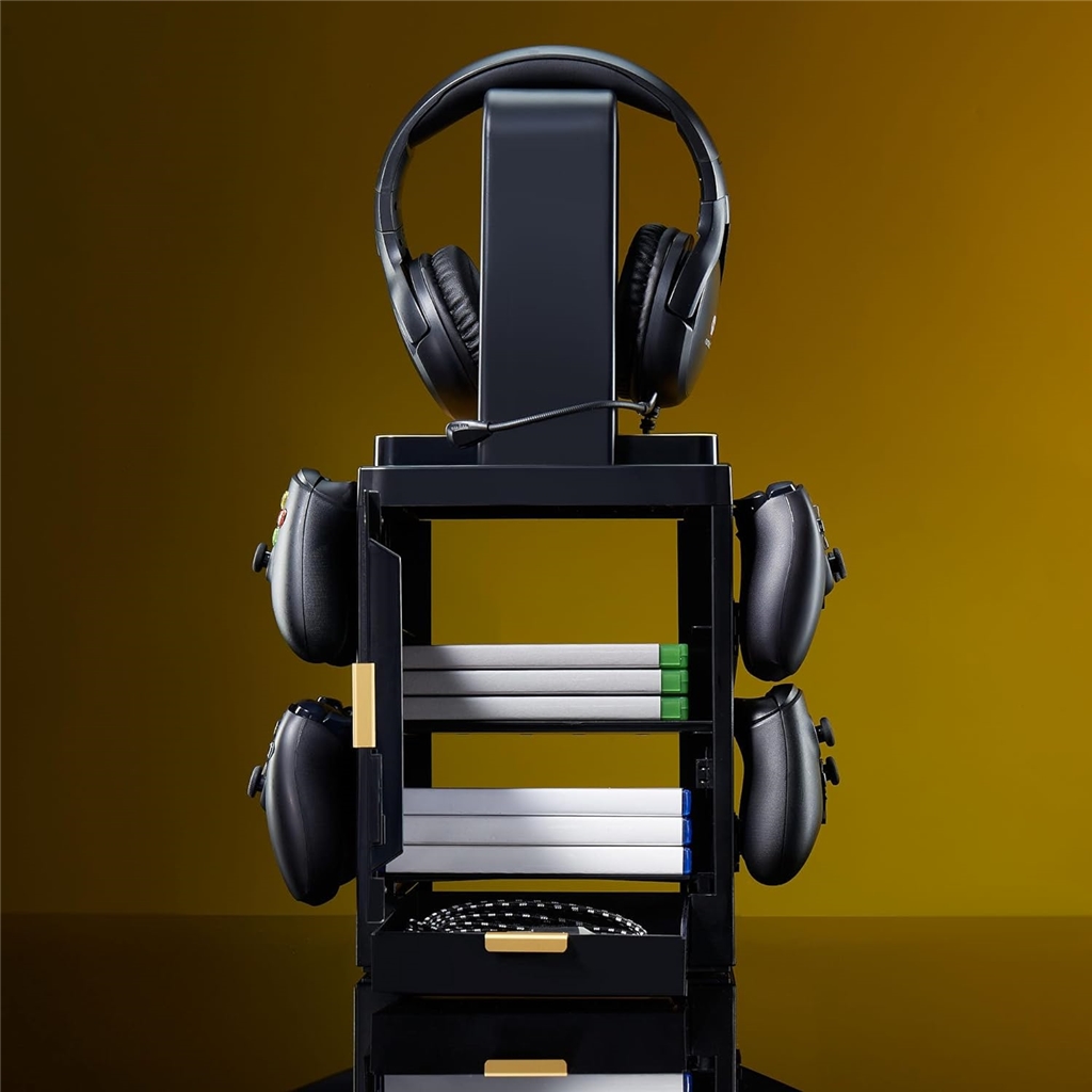 Ovaj ormarić sadrži dodatne pretince za sve vaše gaming potrepštine. Sav pribor, kabeli, kontroleri i druga oprema za Switch, Xbox ili PS4 sigurno se pohranjuju u donju ladicu. Pružite svom gaming headsetu savršeno mjesto — ovaj ormarić ima na vrhu siguran držač za slušalice.