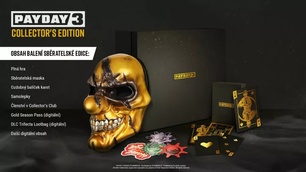 - članstvo u The Collector's Club (online) - ekskluzivno članstvo u zatvorenoj zajednici dostupno samo vlasnicima kolekcionarskog izdanja; ovi članovi dobit će pozivnicu na online diskusije s developerima PAYDAY 3 i dobiti pristup dodatnim ekskluzivnim prilikama