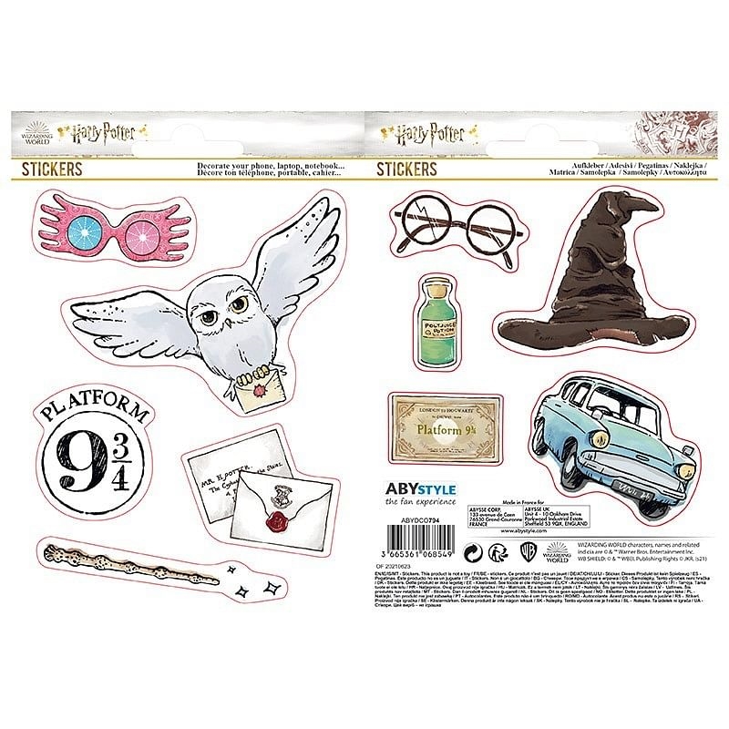 Set sadrži 2 lista naljepnica s motivima iz Harryja Pottera, kao što su npr. Mudri šešir, sova Hedviga, simbol perona 9 i 3/4, naočale Lune Lovegood i druge. Pogodno za ukrašavanje npr. vašeg laptopa ili pametnog telefona.