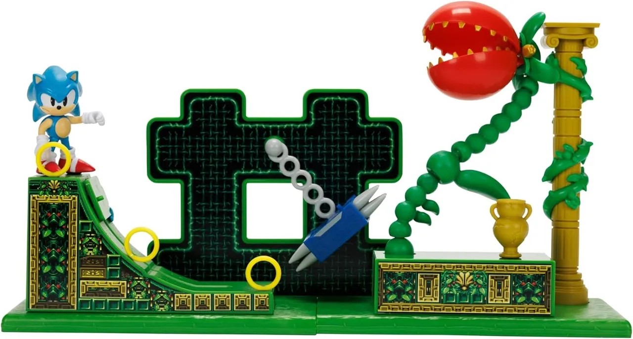 Skup igre Sonic The Hedgehog Stardust Speedway Zone s figuricom Sonica. Djeca mogu smišljati vlastite priče temeljene na ovoj klasičnoj razini iz video igara Sonic the Hedgehog! Set uključuje figuricu Sonica od 6,5 cm i dijelove okoliša s funkcionalnim mehanizmima. Natjerajte Sonica da brzo trči niz padinu i pokupi sve prstenove. Skočite na ljuljajuću platformu Spike Platform i prebrodite pad. Pazite na škripavu stabljiku graha! Sve figurice su univerzalni dijelovi igre koji se mogu prilagoditi za duže igranje.
