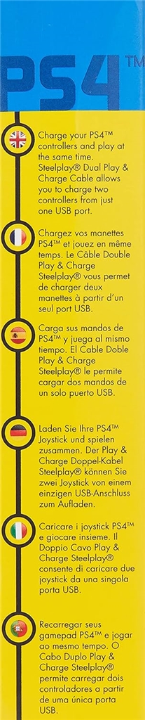 S kabelom Steelplay Dual Play & Charge možete puniti dva PS4 kontrolera preko jednog USB Type-C priključka. Kvalitetni spojni USB Type-C na USB-A kabel dužine 3 m za veći doseg brzo puni. Puni se jednako brzo kao originalni PS4 kabel. Pomoću USB-C kabela za punjenje možete puniti kontrolere izravno na igraćoj konzoli ili računalu i pritom istovremeno igrati. Ugrađene zaštite od kratkog spoja, prenapona, prekomjerne struje i pregrijavanja osiguravaju stabilno i sigurno punjenje.