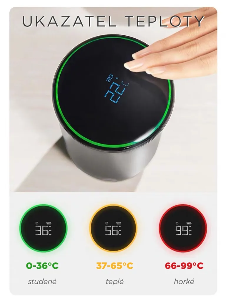 Cooling Cup C2 nudi kvalitetan šareni dodirni LCD zaslon koji će vam u svakom trenutku pokazati temperaturu tekućine u boci. Osim temperature, postoji šarena traka oko oboda za brz pregled temperature. Zelena boja za temperature do 36°C, narančasta boja od 37°C do 65°C i crvena za temperature iznad 66°C.