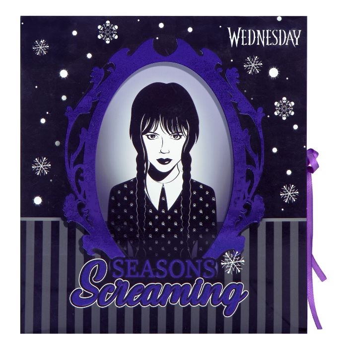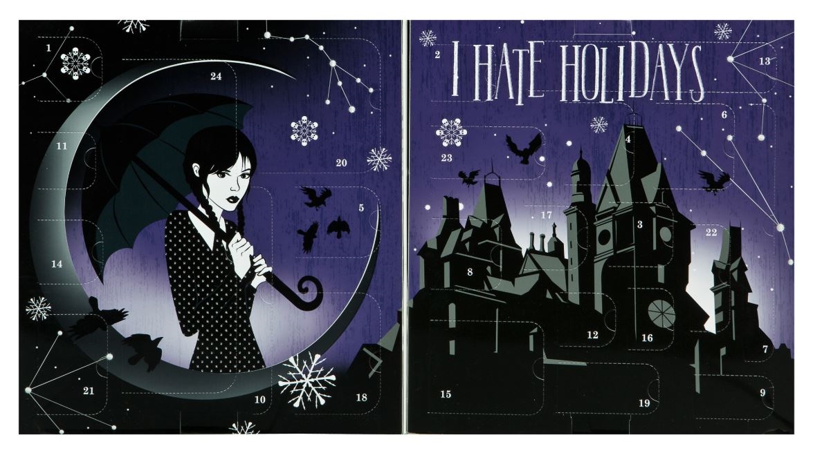 Iza 24 vratâ adventskog kalendara Wednesday kriju se mračni i stilski pisaći pribor inspiriran tajanstvenim svijetom obitelji Addams. Sam adventski kalendar pravi je magnet za oči: može se otvoriti ili zatvoriti mašnom i ukrašen je jedinstvenim motivom Wednesday s metalnim efektom. Sve sitnice koje se od 1. prosinca kriju iza vrata adventskog kalendara možeš koristiti u školu, kod kuće ili u uredu.